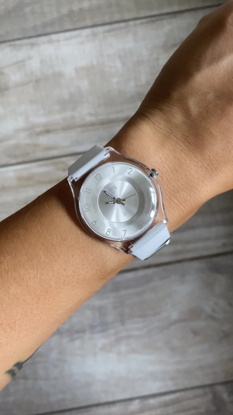 - Material: Caja de acrílico transparente, cuadrante plateado con números e index blancos, y malla de silicona blanca